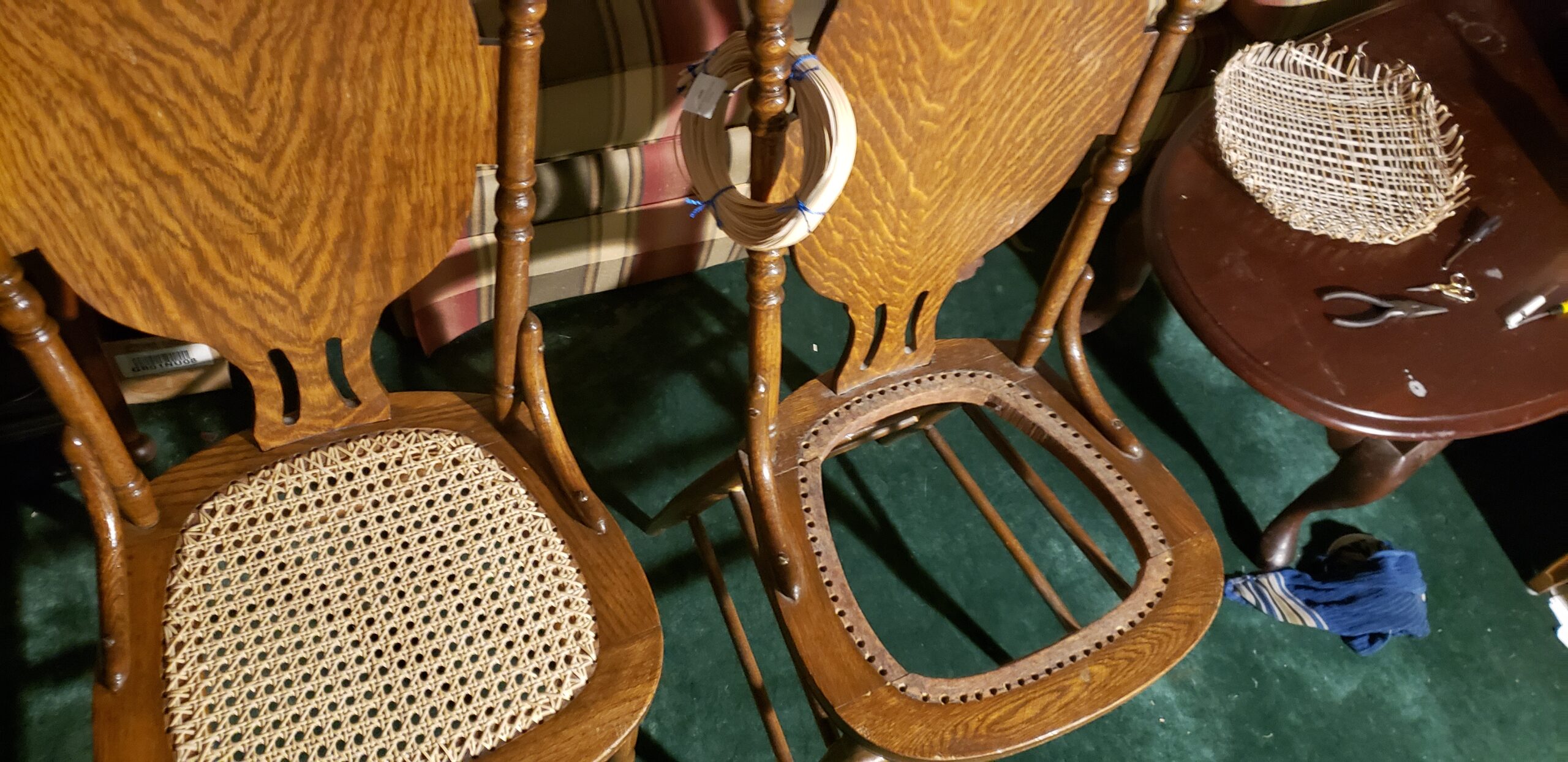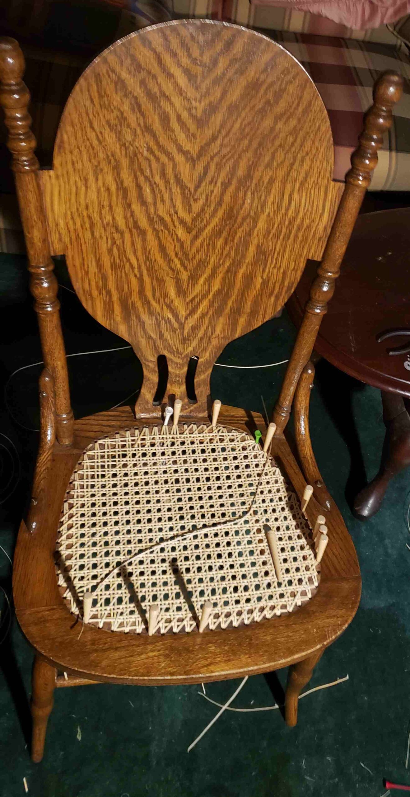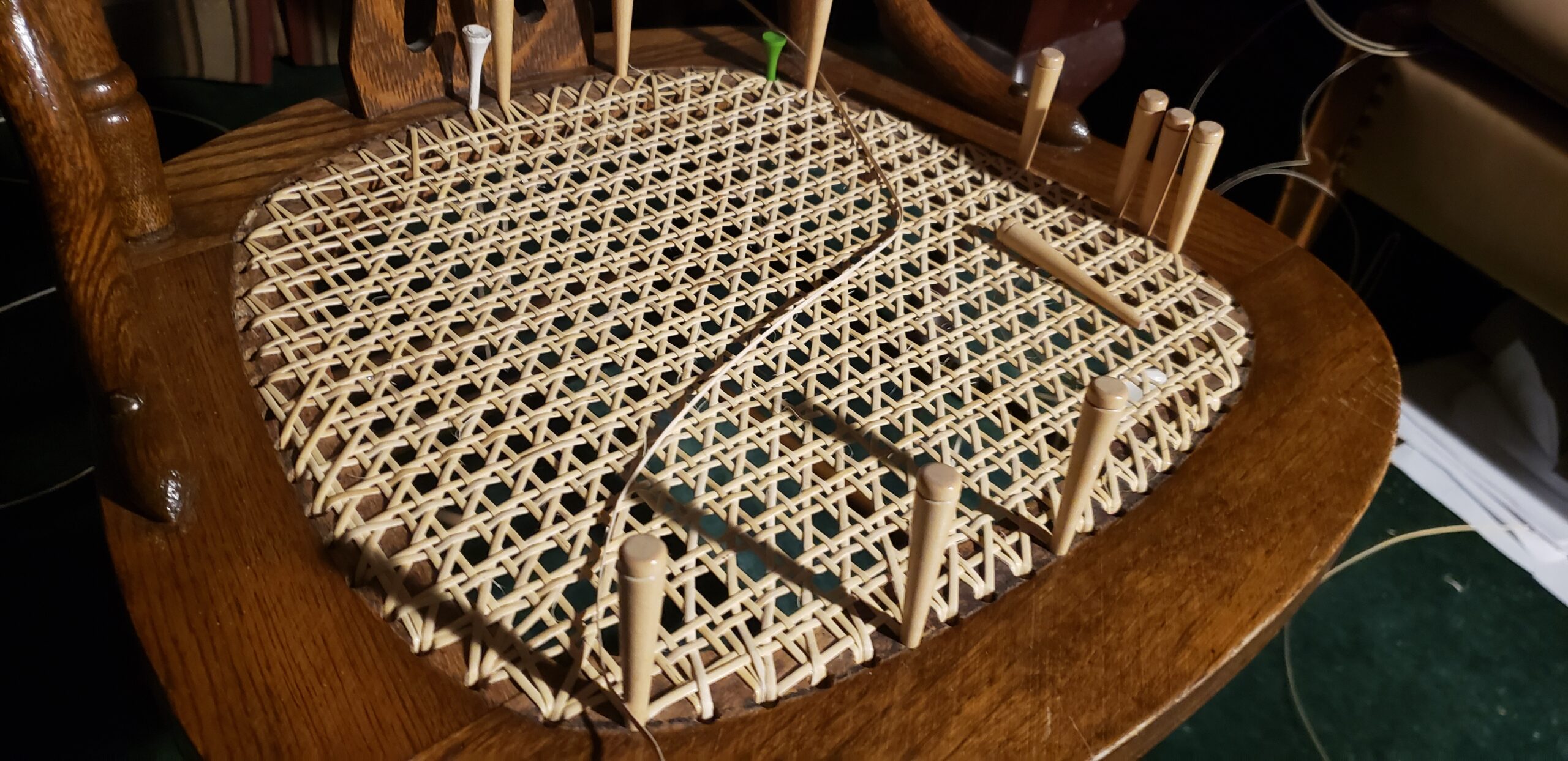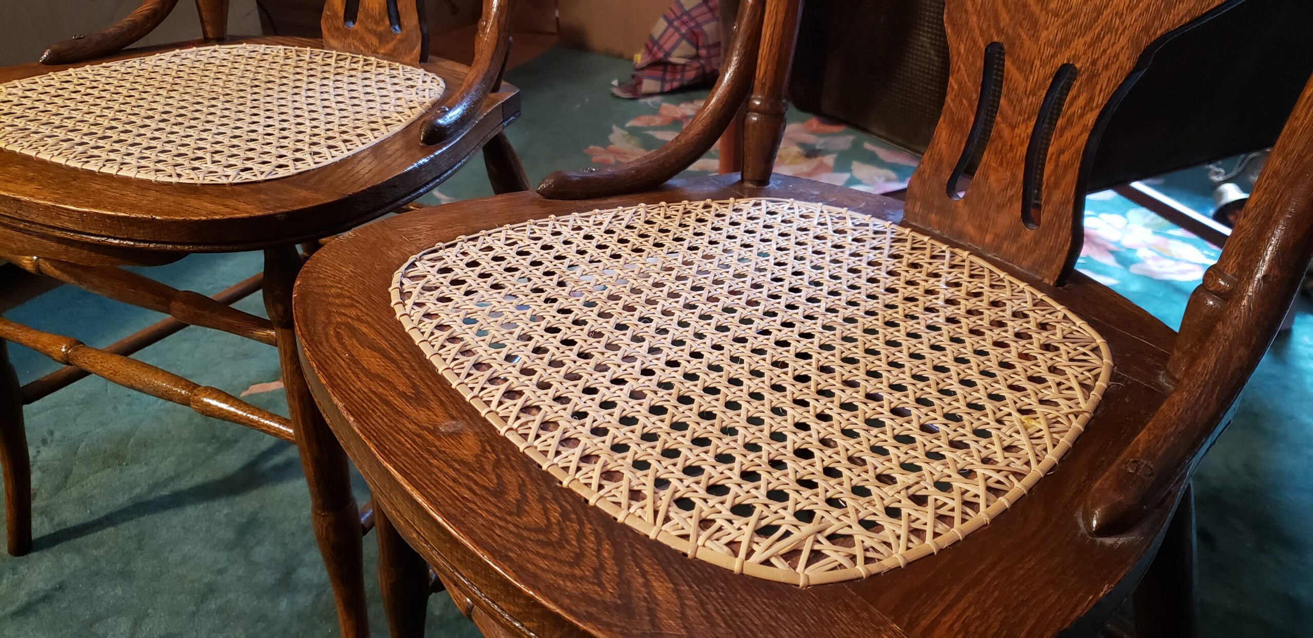 When caning with strand cane, the process begins by preparing the chair frame, ensuring that the seat area is clean and free of any old materials. Strand cane, which is made from the inner core of the rattan plant, comes in long, flexible strips. The craftsman first soaks these strands in water to make them pliable. Then, they begin by lacing the strands through the holes in the chair’s frame in a series of over-under patterns, typically starting from the center and working outward. This method allows for a classic, intricate design that not only supports the chair’s weight but also provides aesthetic appeal. Once the pattern is established, excess cane is trimmed, and the ends are secured, often using a mixture of glue and small dowels to ensure a tight, robust finish.